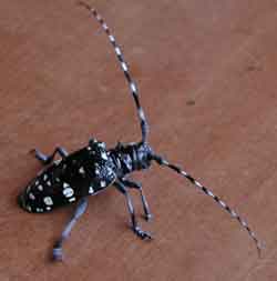 結果養分が上部に流れなくなり葉っぱが黄色くなり落葉して枯れてしまいます。もし天牛ならばミカンの主幹部の地際部に食害した穴があり、木屑がでています。 葉が黄色くなってしまっては手遅れの可能性が高く、もし再生してもその後の生育は不調となります。ただ地際部ではなく枝の比較的上部に発生した場合は、その枝を切り取ればその下の樹は助かります。枝の切り口を見て虫の穴がある場合はその枝の下部に幼虫が潜む場合がありますからさらに切り下げて正常な切り口まで下げてください。 質問1ヶ月前から甘夏の幹(根本)から樹液が3カ所流れ出ています。1m位上の幹からも1カ所流れいます。すこし粘りけがあり、ゼリー状に固まったのもあります。甘いのか、ありが沢山集まっています。かみ切り虫にやられたのかと思い根本の土をのけて、穴を探しましたが見つかりません。このままだと枯れてしまわないかと心配しています。樹齢は15年近いと思います。対処法を教えて下さい。 カミキリムシが地際部に産卵した場合にも、その部分から樹脂が分泌されますが、その可能性の無い場合は、「樹液が3カ所流れ出ている、すこし粘りけがあり、ゼリー状に固まったのもある」といったことを、考えますと樹脂病の可能性があります。樹脂病は比較的古い樹に多く発生し、5月から7月にかけて発生が多くなります。日焼け、寒害、風害などの傷口から病原菌が入って発病します。梅雨期にかけて黄褐色の樹脂を分泌して異臭を発します。病勢が進みますと病斑部が拡大し,病患部は乾燥して凹陥します。病患部が古くなると表面に亀裂を生じて剥離し,太い枝幹のほぼ全周が変色するようになるとそこから上部は萎ちょうして枯れます。 防除法としては、寒害・干害・風害などによる落葉や高接更新・強剪定などによって枝幹部に日焼けを生じたところから発病しやすく、カミキリムシなどの被害で樹勢が弱っている場合にも発病しやすくなりますので、事前にはこれらの点にご注意ください。 。落葉が多かった時などには,枝幹が日焼けを受けないように白色塗布剤を塗布するか藁を巻くなどして保護する。つまり直射光線が直接幹などに当たらないようにする必要があり、太い枝などの切り口にはトップジンMペースト,などの塗布剤や癒合剤を塗布して保護します。亜主枝や側枝の発病枝は,病患部より下部の健全部分で切除し,切り口部に前記の塗布剤を塗布してください。 太い枝幹部の病患部は,その部分を削り取る外科手術を行ない,削り取った部分に前記の塗布剤を塗布してください。ただしあまり大きく削り取りますと養分が流れなくなって枯死します。この外科手術は5〜8月の間に行なうと癒合が早くて治癒しやすいです。 かみ切り虫の穴を探したとのことですが、カミキリムシの穴を発見できるくらいの大きさになるのは、成虫になって、外部に出た後でなくては、発見できません。つまり穴が見つかるころには、もう出て行ってしまっている可能性が高いのです。 Q2 私の所の甘夏はどちらかと言うと透明または乳白色の樹液で、異臭もないので、樹脂病ではな いと思います。 カミキリムシに産卵されたら、樹液が出るの場所は、産卵場所からでしょうか?そして、その穴はどのくらいの大きさに成るのでしょうか?見つけて取り除きたいと思います。もし透明な液だとしますと、樹液そのものなのかもしれませんね。 さてカミキリムシの産卵した場合の穴ですが、ま1〜2ミリ程度の縦の裂け目のように見えます。穴そのものは肉眼では見えません。 そして少しずつ木質部に進入を開始して1年後には直径1センチくらいの穴ができます。そして樹液は、卵を押し出すために出ますの で産卵場所から出ます。 Q3もしその後、その部分から木くずが出てきましたら、防除の必要がありますが、現在のところ虫がいるかどうかわかりません。時々患部を見回ってみて木くずが出るようでしたら、Q1で書いたように、針金などで防除してください。農薬につきましてはあるにはありますが、おそらく少量では手に入れにくいばかりでなく、手に入れても使い切れず、農薬の保管や、廃棄にリスクを伴います。そこで考えている資材にボーベリア菌(商品名バイオリサ)を使った防除があります。これは 根本に菌を着けたバンドを巻き付け、その上を通ったかみ切りを殺虫する物です。安心安全を指向する私は、化学合成農薬でないこの資材に注目しています。 |