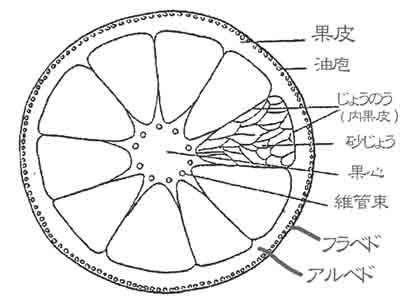 みかんを植物学では、果皮は外果皮(表皮とつぶつぶした油胞を含む 色素層で、フラベドと呼びます)と中果皮(白いスポンジ状の組織でアルベドと呼びます)、それに内果皮 (じょうのう−袋ー、+砂じょう−砂のう−、いわゆる果肉部です)また発生学的には果実は葉が変形して 発生したものであり、フラベドと果肉部は葉の表と裏に相当し、アルベドは葉肉にあたります。 砂じょうは葉の裏に生えた毛に液汁がたまったものであり、その集合体が果肉に当たるものです。 つまり ミカンは心皮(葉の変化した物)が10〜12個合体して出来た物と理解されます。要するにみかんの皮から 出来た果実はフラベドとアルベド、それに果肉部は発生した元が違うということで、行動が三者三様で果 実の浮皮や裂果などの現象が現れます。(河瀬氏) それでは実際にはどのように発生するかと言いますと成熟期に果実の臍の部分からの裂果が多く水分の 過不足の急激な変化が原因です。晴天続きで果皮の硬化して、多雨の時、日光の直射する果実が害を 受けます。耕土の浅い園、カイヨウ病被害果、夏の薬剤散布で、果皮の硬化した果実になどに多く発生し 、枝葉に被われた果実には発生が少ないようです。 温州みかんでも全く同じ理由で裂果が起こります。どちらか言いますと皮の薄い早生温州に発生が多く 晩生の青島などは比較的少ないようです。 |