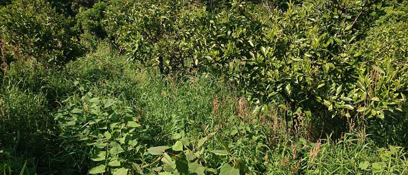 農場は一年中大量の草だらけ。草を刈り取るのは一部安全のための通路とカミキリ防止のため幹の半径30センチのみで、基本収穫前1回のみ、場所によってはみかんの木より高く伸びた草もあります。